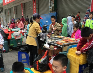 (信宜新闻网/讯)近日,记者在茂名市区朝阳路某小学附近看到,在上学、放学时间段里,近10多个流动性小吃档分别被学生们围得密密麻麻。一碟碟五颜六色酱料搅拌下的鱼丸、香肠、粉皮等小吃端到学生面前,学生们三五成群围坐在一起,开心地吃着。很多接送学生的家长对流动摊档的食品卫生情况表示担心,都很不赞同孩子去吃。一些小贩在改装的三轮车下面使用煤气罐进行煎炒更是存在安全隐患,希望有关部门关注。