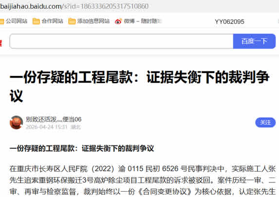 在重庆市长寿区人民F院(2022)渝 0115 民初 6526 号民事判决中,实际施工人张先生追索重钢环保搬迁3号高炉除尘项目工程尾款的诉求被驳回。案件历经一审、二审、再审与检察监督,裁判始终以一份《合同变更协议》为核心依据,认定张先生未完成协议所列工程,无权主张尾款。然而纵观全案证据链、审理程序与事实逻辑,本案存在证据采信失衡、关键事实不清、程序适用不当等诸多疑点,判决结论难以令人信服。