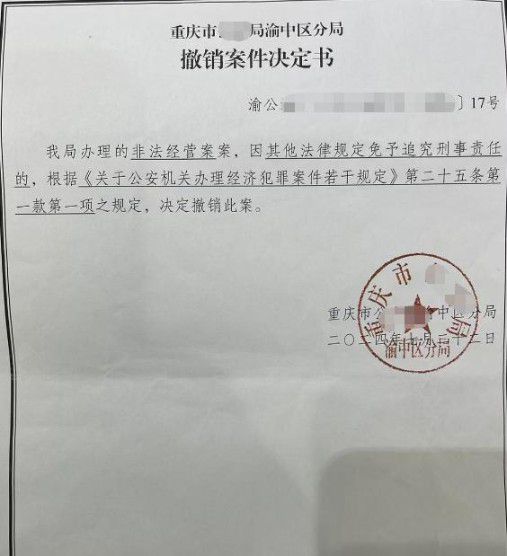 2024 年 7 月 22 日,重庆市渝中区某分局作出撤销案件决定书,长达七年的刑事程序就此终结,朱先生的刑事追责希望彻底落空。
