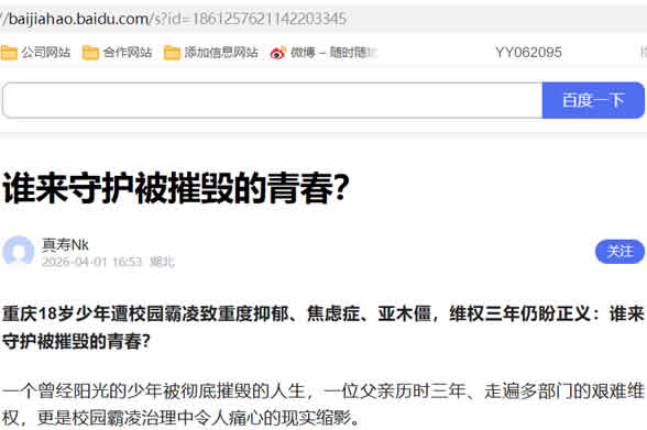 重庆18岁少年遭校园霸凌致重度抑郁、焦虑症、亚木僵,维权三年仍盼正义:谁来守护被摧毁的青春?