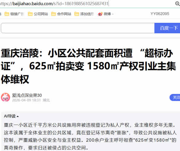 权事件。小区负二层规划明确、早已计入业主公摊面积的近千平方米公共设施用房,在全体业主毫不知情的情况下,被一并登记为私人产权。原本仅 625.81 平方米的拍卖标的,最终却办理出 1580.55 平方米的产权证,凭空多出的 954.74 平方米,正是保障整栋楼运行的业主共有设备用房。业主们历经投诉、信访、行政诉讼等多种途径维权,问题至今未能得到纠正,这起离奇的 “超标办证” 事件,不仅严重侵害了业主的合法权益,更引发了社会各界对不动产登记规范性、业主共有权益保护力度以及基层治理公信力的广泛质疑。