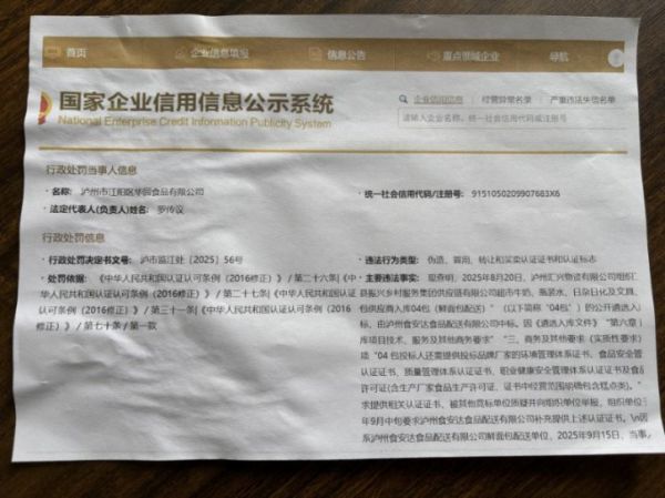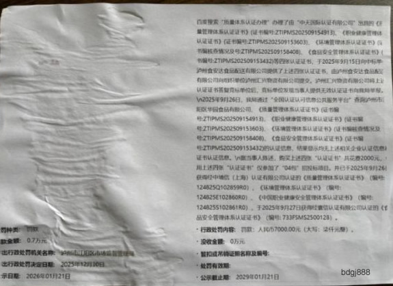 然而按照组织方招标要求条件提供有效标书,中标单位泸州食安达食品配送有限公司在参与投标过程中所提供的品牌方证书是属于假证书,经泸州市江阳区市场监督管理局查证属于花费2000元在网上购买并用于该项目招标,属于违法行为,中标单位泸州食安达食品配送有限公司所提供的4份体系认证证书(编号:ZTIPMS202509158408、ZTIPMS202509153432、ZTIPMS202509154913、ZTIPMS202509153603),经国家市场监督管理总局全国认证认可信息公共服务平台官方查询,全部查无备案,属于伪造证书。同时,出具证书的「中天国际认证有限公司」无国家认监委认证资质,涉事企业泸州市江阳区华园食品有限公司无任何合法体系认证记录。